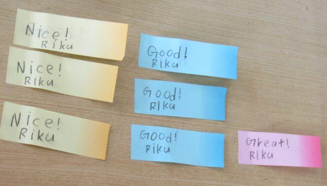 発表後、互いに評価し合います。評価は3段階、ナイス! グッド! グレイト! 付箋に評価を書いて、自己紹介文の紙に貼っていきました。グレイトだったかな~?(^^)