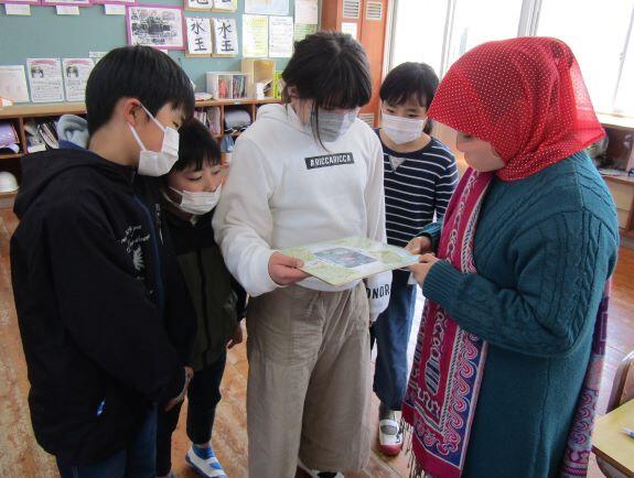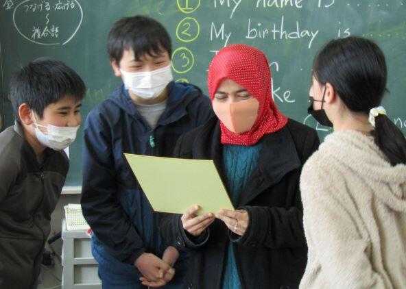 最後に、それぞれのクラスで、お礼の言葉を書いた、色紙をお渡ししました!(^o^)エイティム先生はとても喜んでくださいました。(^_^)v 漢字なども入った日本語で書いてあるので、エイティム先生には全て理解するのは難しかったようです。そこで、子どもたちが読んであげました。ほほえましい光景ですね!3月はこんな光景がたくさん見られますね。