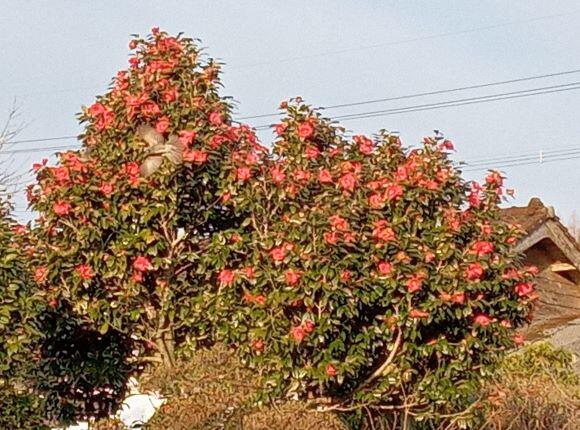 下は校門前の通学路にある椿です。朝日に映えて赤く見えました。見えにくいですが、左の方には鳥が飛び立つ様子が見えますよ!(^^)