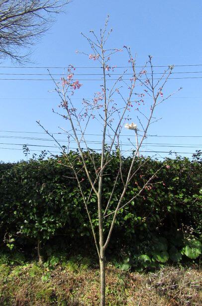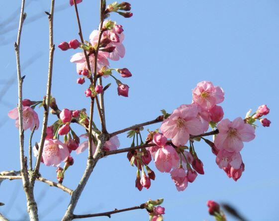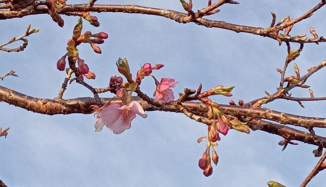 下は運動場の下のお宅にあった木です。名前は分かりませんが、きれいな赤い花が咲いていました。また、もう一つは寒桜?河津桜?でしょうか?花が咲いていて、つぼみも膨らんでいました!(^^)