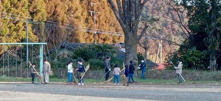 そんな春の陽気の中、子どもたちは・・・というと。朝ボラを頑張っています。下は全員で落ち葉掃きをしているところです。お疲れ様です。(^^)/