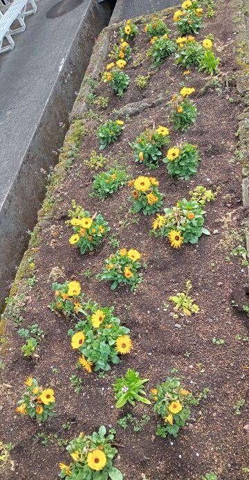 花壇にはキンセンカがきれいな黄色い花を咲かせています。そして、昨年の2月に植樹した桜の木に花が咲きました!(^_^)v 今年も植えたので、来年が楽しみですね!