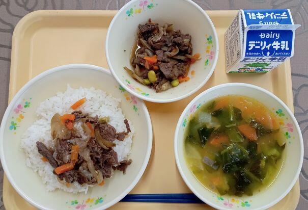 最後はこの日の給食です。この日は【こばやし地産地消の日】ということで、地元の食材を使った給食でした。メニューは 牛とごぼうのこすもー丼、かねんしゅい でした。かねんしゅい は小林市や隣の都城市などに伝わる郷土料理です。かね=さつまいも、しゅい=汁 という意味です。サツマイモのデンプンを団子にして汁の中に入れてありました。東方学校給食センターのみなさん、ありがとうございました!(*^_^*) 美味しかったです!