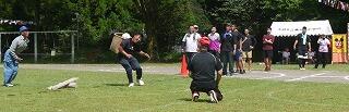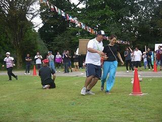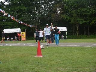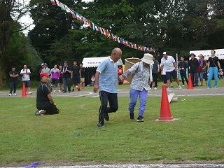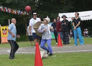 かごを背中に背負い、「左近太郎」でボールをとばして、かごに入れる競技です。