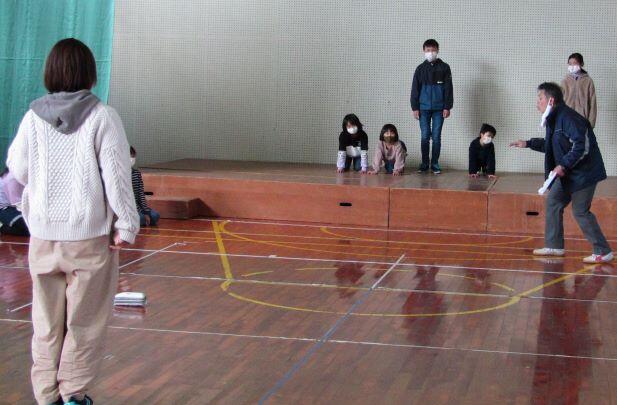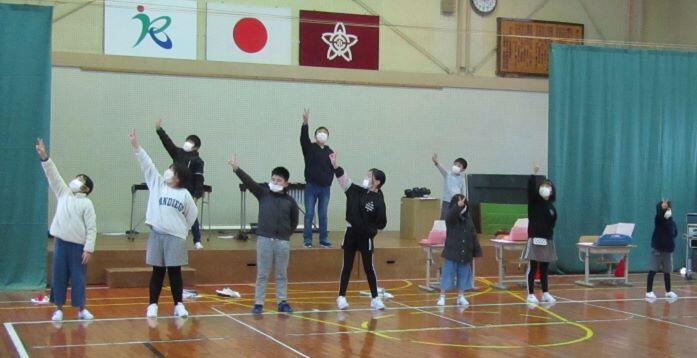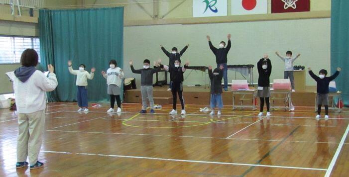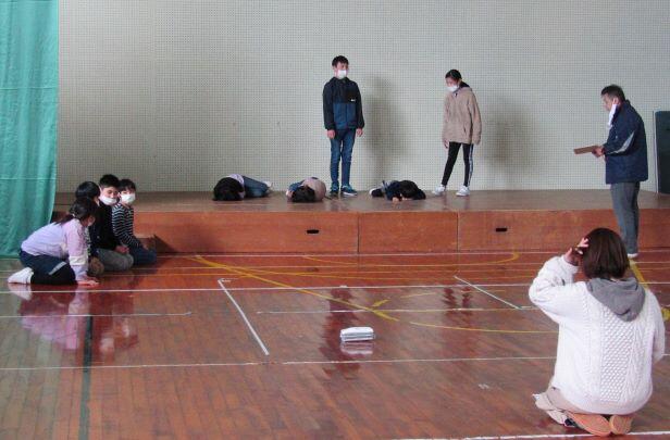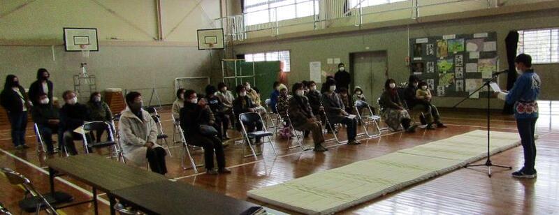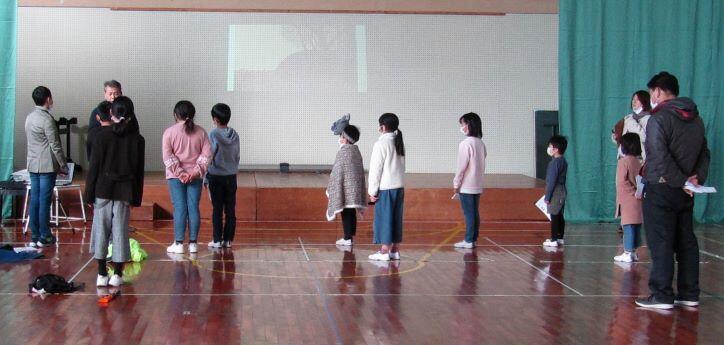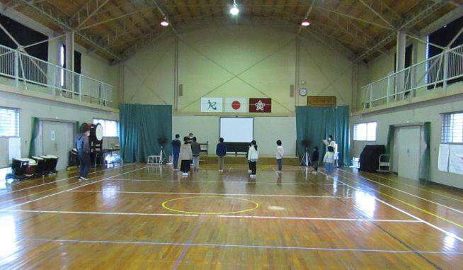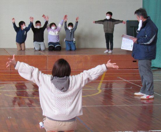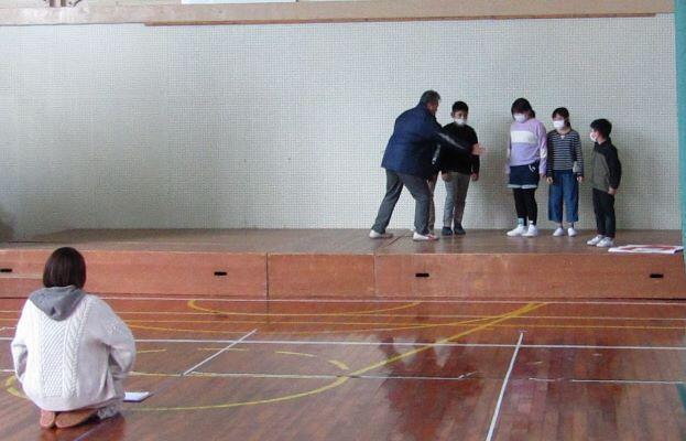 立ち位置の説明や間隔、向く方向などの指示がありました。さあ、立ち稽古です!もろかた弁が体育館に響きます!