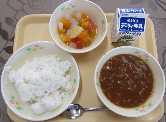 最後はこの日の給食です。次の日=1月22日は「カレーライスの日」なので、給食はチキンカレー、フルーツポンチ