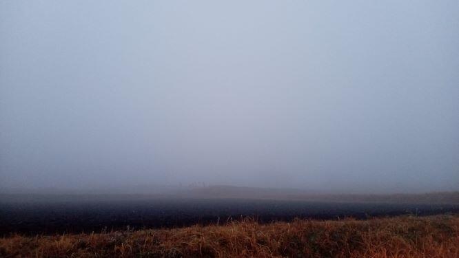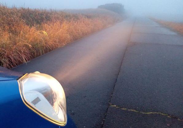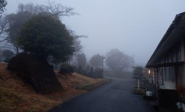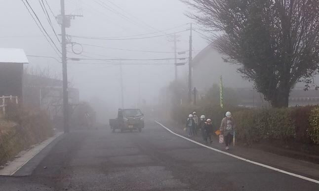 霧が深く、車のライトでも先の方がよく見えませんでした。学校でもこんな感じでした。