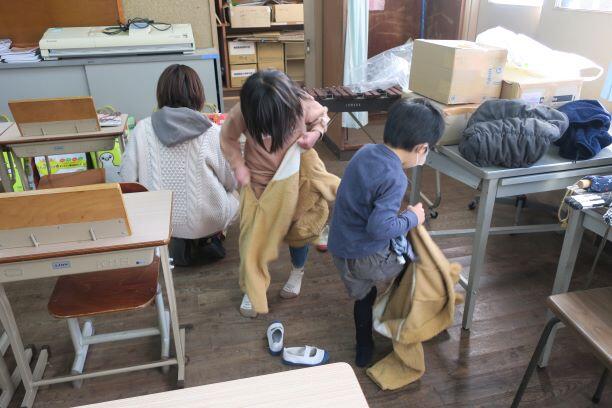 あれっ、1年生が何かを着ていますよ~(^_^) 後ろ姿も可愛いですね。ハイ、チーズ!