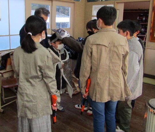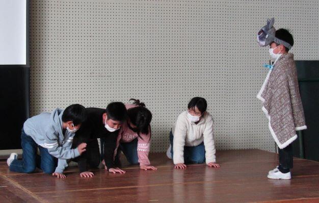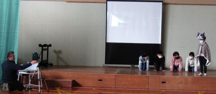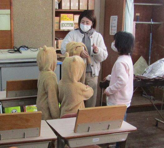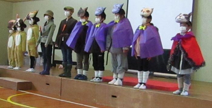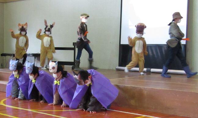 二人の猟をする人がやって来ました。1・2年生はナレーターとドアの役目をします。(^_^)