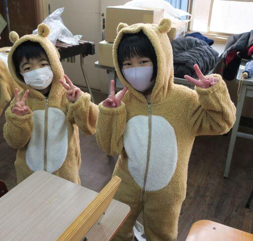 他の子どもたちも衣装を身につけています。1年生が着ぐるみでうろうろ・・・(^_^;) 頭に何をつけているのでしょうか?