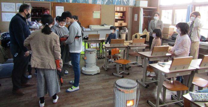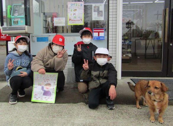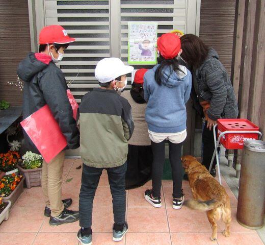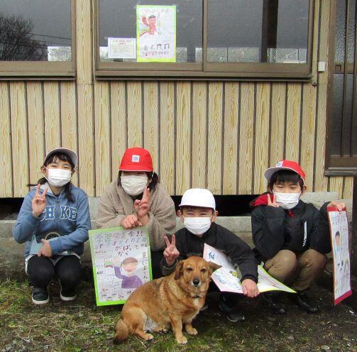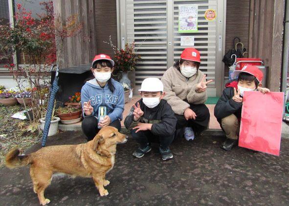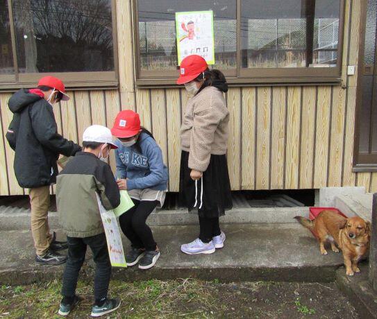 最初は学校のすぐそばの公民館です。見守り犬も来てくれました。ハイ、チーズ!(^^)その後も一緒に回ってくれました。(^^)/