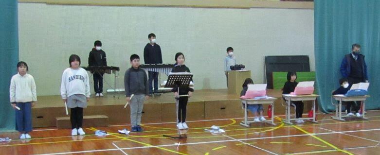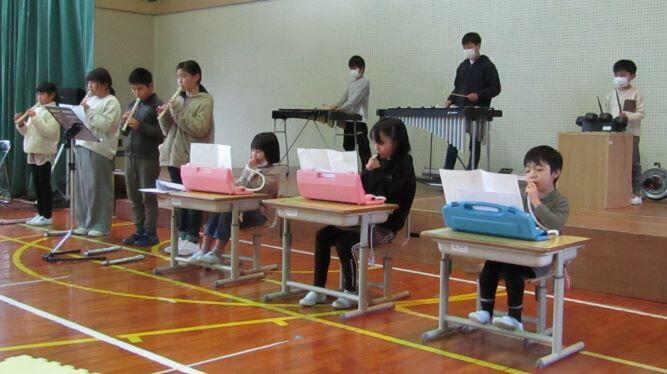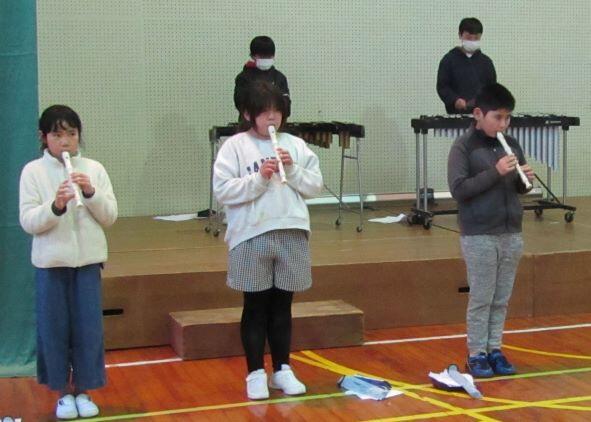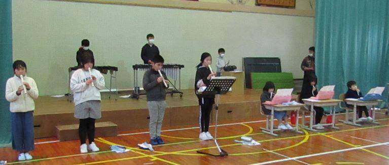 演奏してみます。1・2年生の鍵盤ハーモニカはどうかな?すぐ後では教頭先生が見守ってくださっていいます。