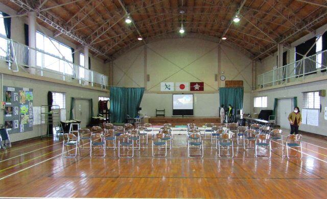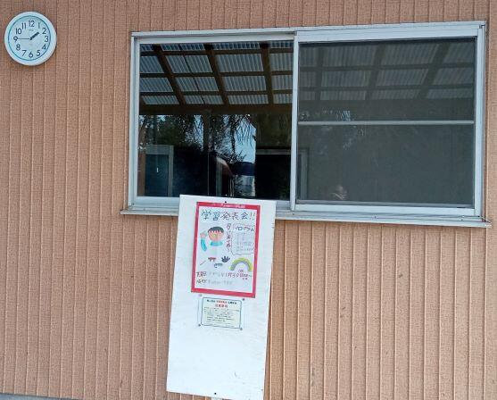 4軒目は、学校から遠い(約4km)ところにある公民館です。子どもたちとは行けなかったので、私が貼りに行きました。
