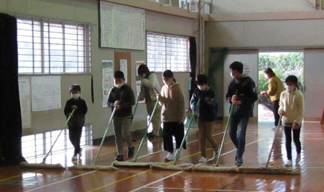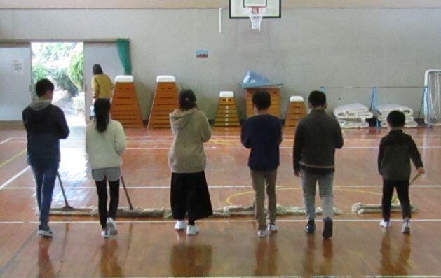 さあ、始めますよ!(^o^) モップをかけます。きちんと並んで~。マットを敷きます。何のため?