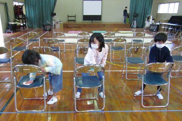体育館の入り口の掃除等をしていた1・2も加わって、机やイスを除菌シートで拭きました。(^^)