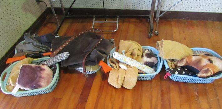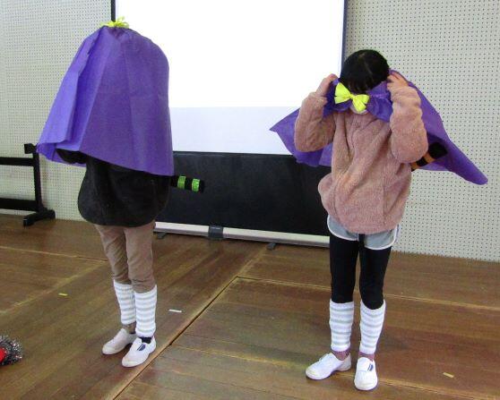 太鼓練習の後は、劇の衣装合わせです。担当の先生が衣装や小道具をたくさん持ってきてくださいました。