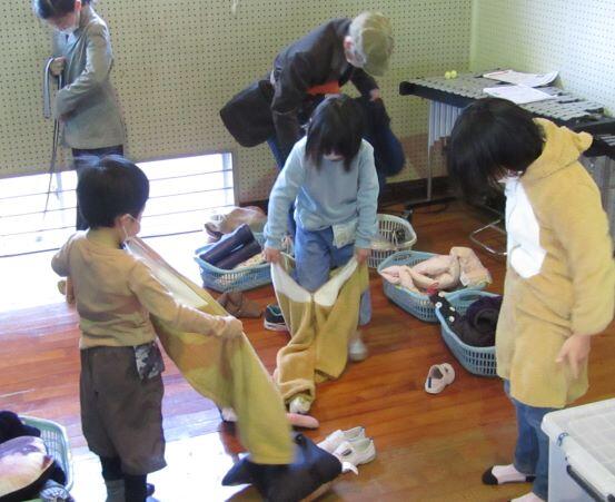着替えの練習も必要です。こんな感じで着替えていました。山猫の親分はお手伝いが必要でした!(^_^;)