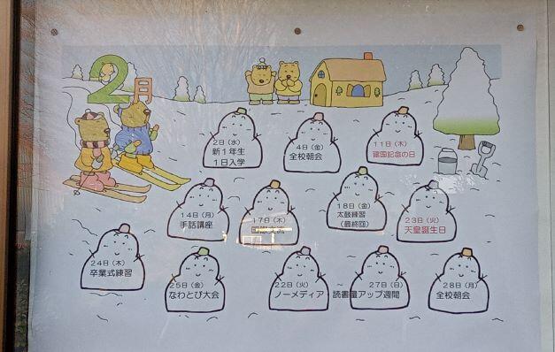 2月になりましたので、校門の掲示板も替わりました。2月にはどんな行事があるのかな?17日は「国際交流」です。