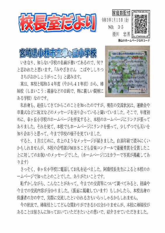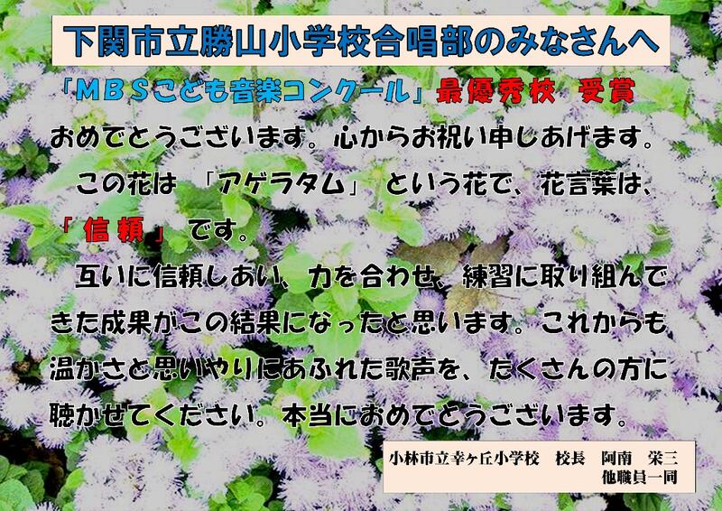 さて、幸ヶ丘小学校には姉妹校があります。ご存じでしたか?山口県下関市立勝山小学校です。毎日、勝山小学校のHPを見ています。昨年末のHPに「MBS子ども音楽コンクールで最優秀校受賞」の記事がありましたので、お祝いのメッセージを送りました。その件について勝山小学校の校長先生がHPや「校長室だより」に載せていただきました。「校長室だより」には姉妹校になったいきさつ等も掲載されていましたので、校長先生に許可をいただき、本校のHPでも掲載させていただくことにしました。