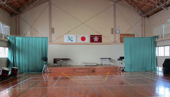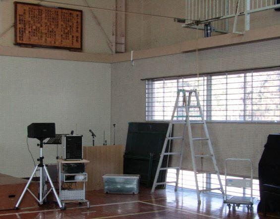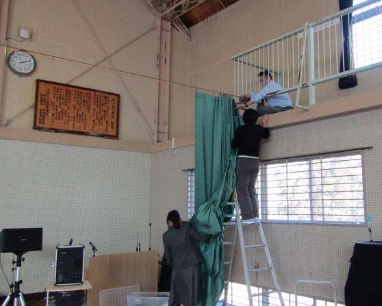 体育館のステージにはカーテンがありません。学習発表会の時にはカーテンを付けます。3人がかりで、うんとこしょ、