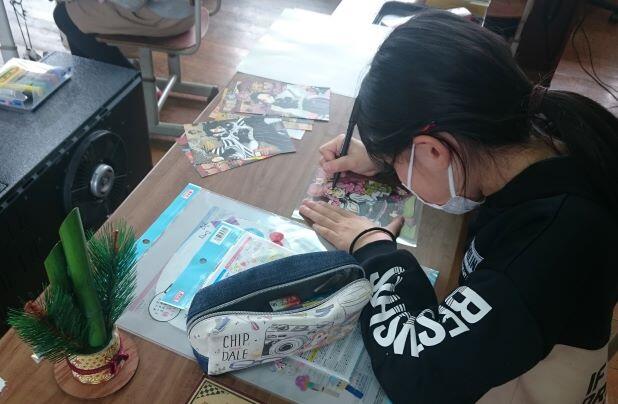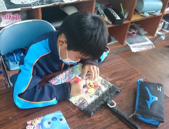 プラスチックの透明な板に、好きなキャラクターの絵をペンで描きます。色を塗っても構いません。みんな黙々と