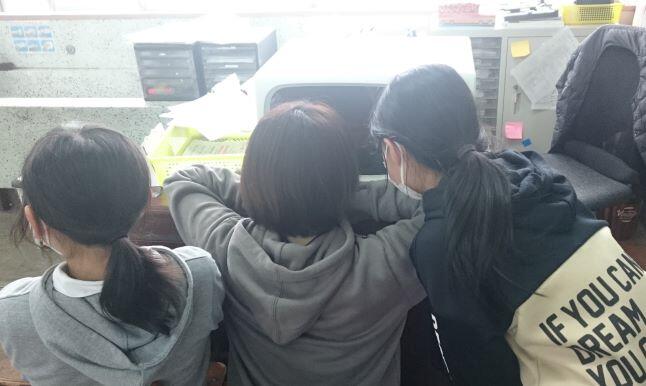 レンジをのぞいている先生と子どもたちです。(兄弟姉妹みたいですね。(^_^)) ハイ、完成です!