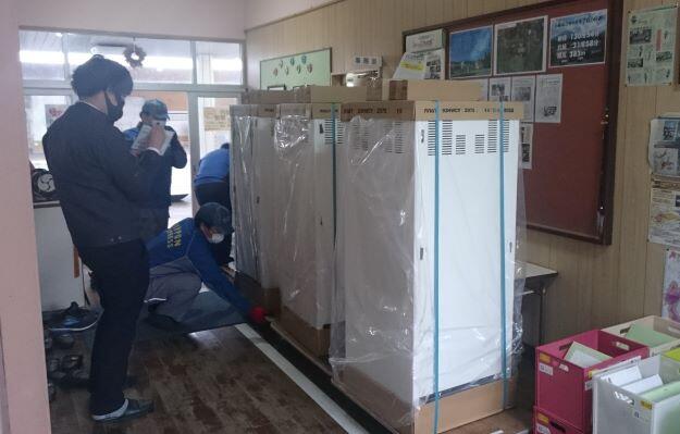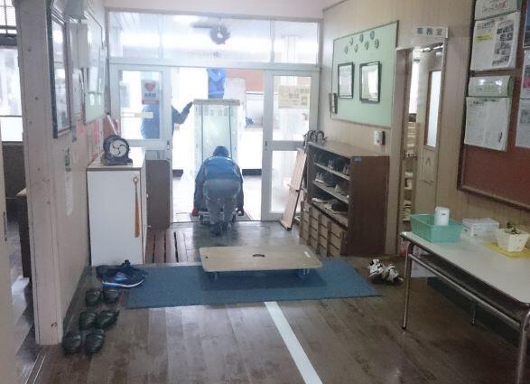 9時過ぎに到着しました。教室棟の近くまで、トラックで行くことができないので、玄関からの搬入になりました。