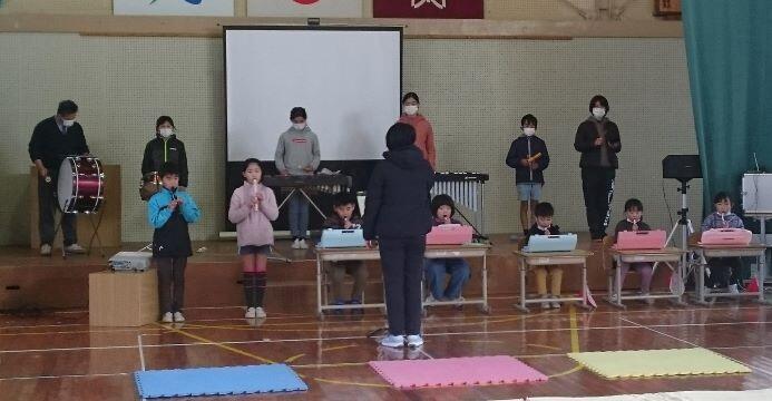 全校合奏です。今回はコロナの影響で合唱の練習ができず、合奏のみになりました。4曲続けての演奏でした。