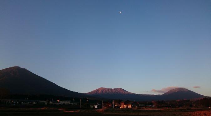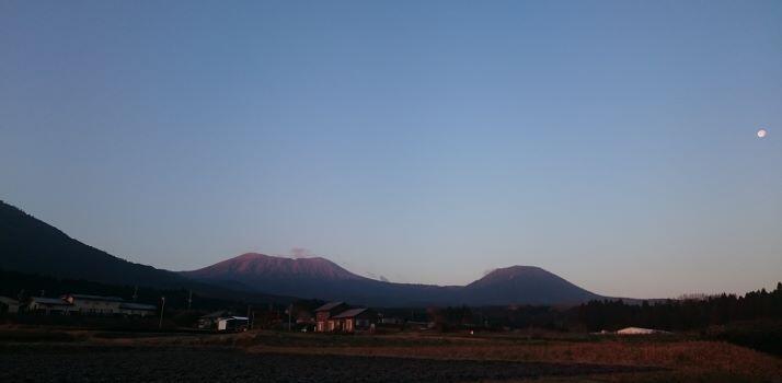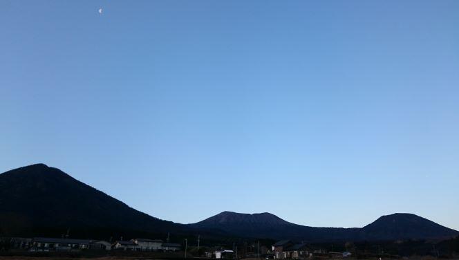この日の幸ヶ丘三岳です。この日の朝も冷え込みました。韓国岳の頂上部分は白くなっていましたし、ここだけ雲が溜まっているように見えました。この日も違った風景が見られました。日々変わる姿が、見ていて面白いです!(*^_^*) 月も写っていますが・・・分かりますか?
