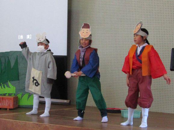 さあ、発表の始まりです!1・2年生は劇 幸ヶ丘版「にぎめし ころりん」でした。3人で おじいさん役、