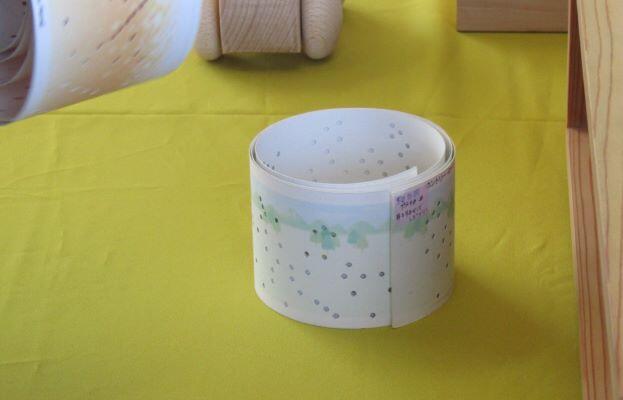真ん中にある木の箱のような物です。手前に機械があるのですが、そこにロール状になっている紙を差し込んで、手回しで