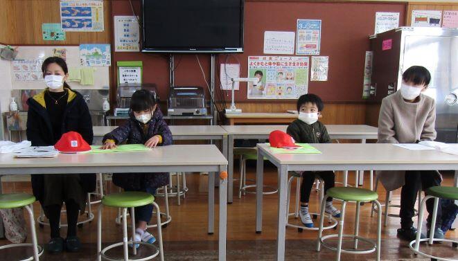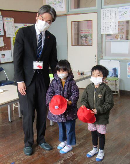 弟さん、妹さんです。説明会のはじめに、小林市社会福祉協議会様から赤白帽の贈呈がありました。また、