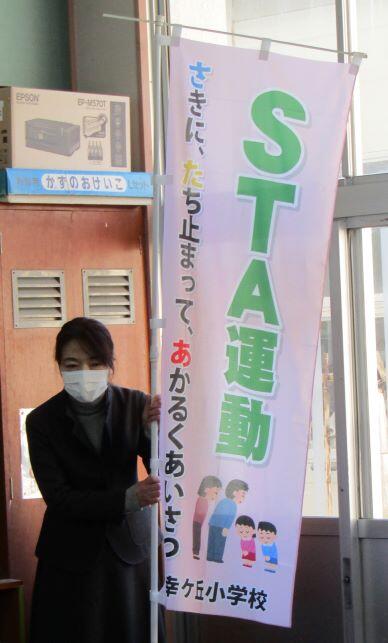 「STA運動」の旗です。S=さきに、T=たち止まって、A=あかるくあいさつ この3つができるようにみんなで頑張って