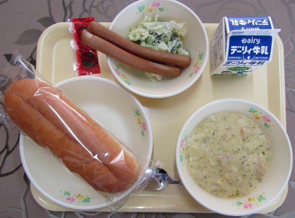 ということで、この日の給食です。スタートの日のメニューは セルフドック(ソーセージ、野菜、一食ケチャップ)、