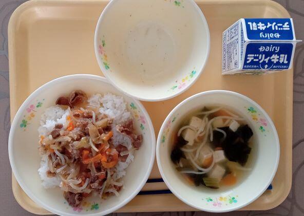 メニューは 牛丼、魚そうめん汁 でした。宮崎牛、本当に美味しいですね!東方学校給食センターのみなさん、いつも