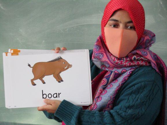 次は・・・あれれ?お昼寝タイム? いえいえ、黒板のアルファベットのカードから1枚、先生が抜きます。