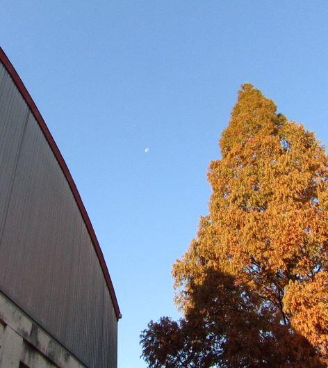 朝日です。雲に隠れていました。雲も面白い形になっていました。(^^) 運動場に出ると月も見えました。
