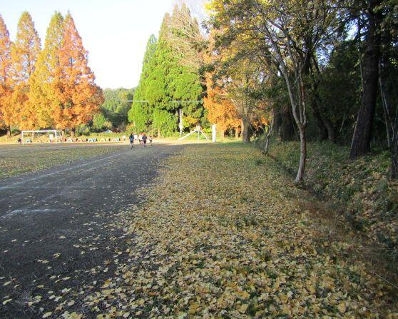 下は持久走練習です。「黄色い絨毯(じゅうたん)」とまではいきませんが、イチョウの葉っぱがたくさん落ちていました。