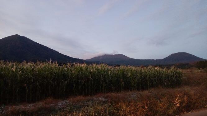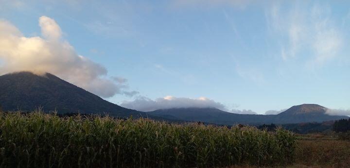 この日の朝の幸ヶ丘三岳です。韓国岳から噴煙が上がり、右側へ流れて・・・という感じでした。(※韓国岳は噴火していませんよ!)