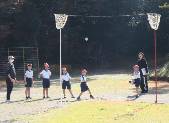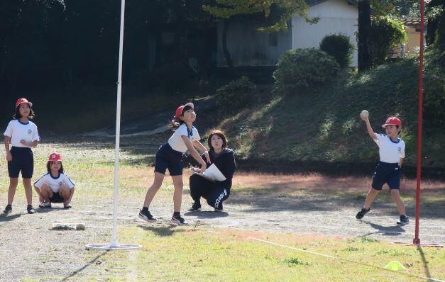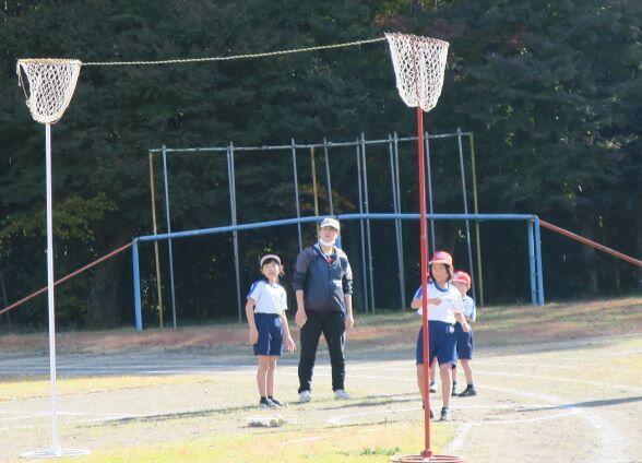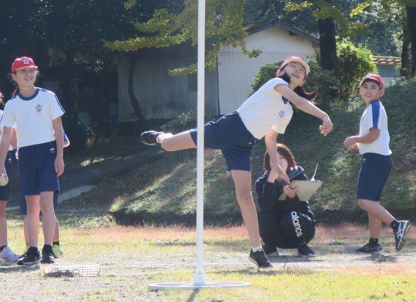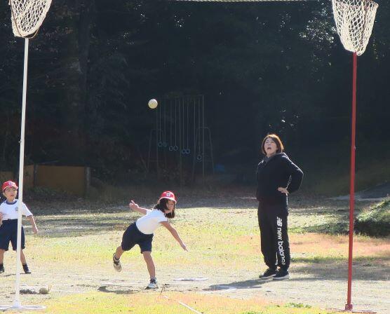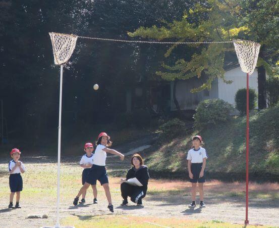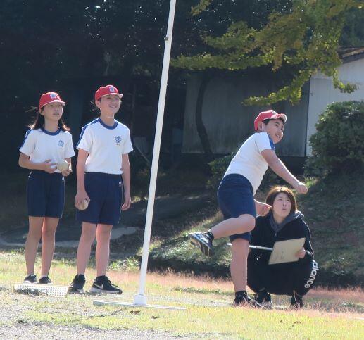 1年生にとっては難しいようです。担任の先生が投げ方を伝授します。こうして、こうやって、こう投げるとよ!