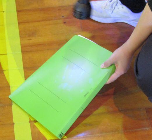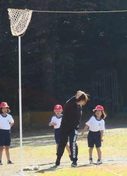 いえいえ、そうではありません。ボール投げのテストの工夫です!(^_^)v カゴを結んでいる白いひもを超えるように