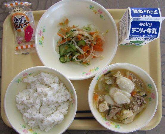 最後はこの日の給食です。メニューは、 麦ご飯、もち入りキムチ鍋、もやしナムル、さつまポテト でした。