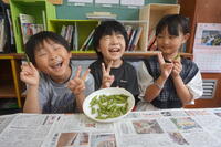 【7月18日】春に植えた野菜の苗が大きく成長し、子ども達は収穫を楽しんでいます。今回は3・4年生が枝豆を収穫しました。水道でしっかりと周りを洗い、塩ゆでにして食べました。校長へもおすそ分けがあり、食べたらとてもおいしかったです。収穫の喜びを味わっている子ども達の嬉しそうな笑顔を見ていると、何ともほっこりしました。