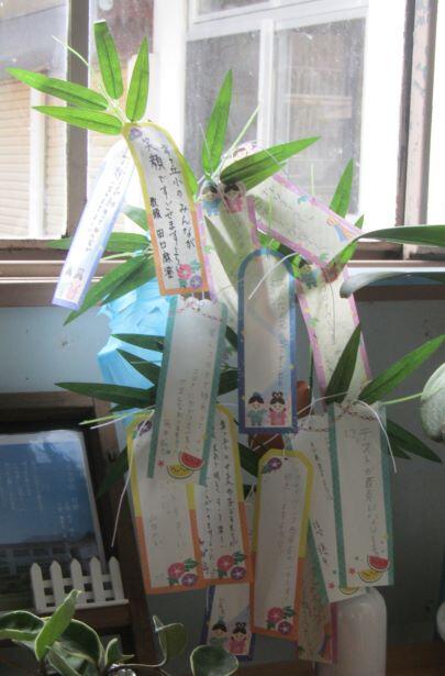 7月14日(火) この日、校内を回っていたら、気づいたことが3つありました。一つ目は、運動場のそばの林から聞こえてくるカラスの鳴き声がやけに大きいこと。二つ目は、飛び回っていたツバメの姿が見えなくなったこと、三つめは、七夕飾りがあったこと。梅雨はまだまだ明けそうにありませんが、鳥たちのヒナは巣立っているようでした。雨が続く中、ヒナたちは大丈夫なのでしょうか。短冊の願い事には、いろいろな願いが書いてありました。