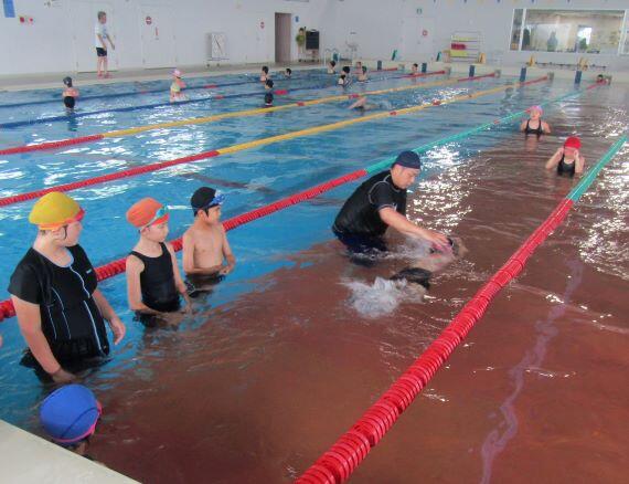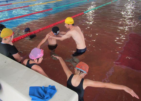 水泳学習の始まりです。この日はコーチの方から指導を受けました。黄色のスイミングキャップの方です。