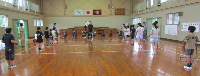 たたき方の指導です。手首を使うことや思い切り良くたたくことが大事ということでした。“バチが折れてもいいから、しっかりたたこう!(^_-)”とも・・・。 あれっ?指導者の方が消えてしまいました・・・。さっきまでいらっしゃったのに・・・。(^^;)