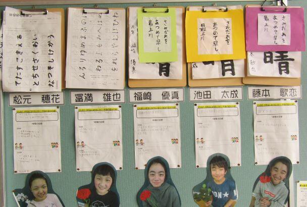 1・2年生の教室掲示です。授業で学習した内容の掲示もありました。3・4年生の教室掲示です。習字(毛筆)もていねいに書かれていますね(^^)/
