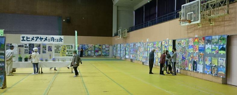 市民体育館の様子です。フロア中に作品が展示、掲示されていました。来場者も多かったです。