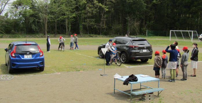 4月15日(水) この日、交通安全教室が行われました。前日から運動場にラインを引き、この日の朝に職員の車を2台入れて準備を終えました。この日はお忙しい中、小林警察署からお一人、小林市交通安全協会から4名の方が来校されて、子どもたちにお話や指導をしていただきました。ニュースでもありましたが、小学生の交通事故は5月が一番多く、また、学年では1年生が最も多いということでした。4月のこの時期に、1年生も参加した交通安全教室が実施できてよかったと思います。警察署、交通安全協会のみなさん、ありがとうございました。