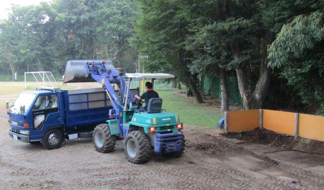 刈った草などを集めてトラックに積み込みます。これまでにためていた草木をショベルでを使ってトラックに積み込みます。